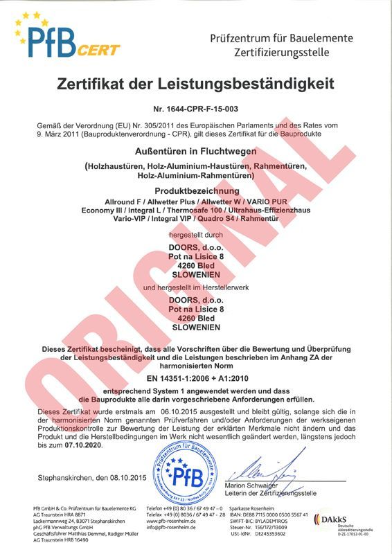 Das seit 2015 vorliegende Zertifikat von Türen für Flucht- und Rettungswege bestätigt die regelmäßige Fremdüberwachung der Herstellprozesse durch das Prüfinstitut PfB Rosenheim. Ein Nachweis über die mandatierte Eigenschaft "Fähigkeit zur Freigabe" erfolgt jeweils bei Auslieferung des Bauelements durch einen zusätzlichen Eintrag in die CE-Leistungserklärung.